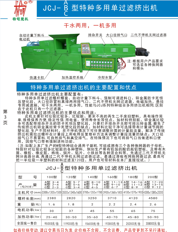 特種多用單過濾螺桿螺套、機動下料斗、強制可調進料口、大口徑強制排氣口、碎金屬防卡死恒壓塑化段、不停機無網過濾器、電磁加熱、專用懸掛減速箱,性能和用途與JCJ系列特種組合多用擠出機相同。